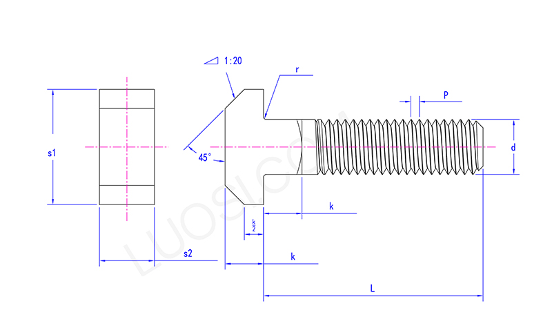 Đầu của bu -lông cổ hình vuông là hình dạng "t" được đặt theo chiều ngang, giống như chữ "T". Đầu hình chữ T rộng này cho phép bu lông bị kẹt trong rãnh hình chữ T của thiết bị, đóng vai trò ngăn chặn bu lông bị kéo ra.